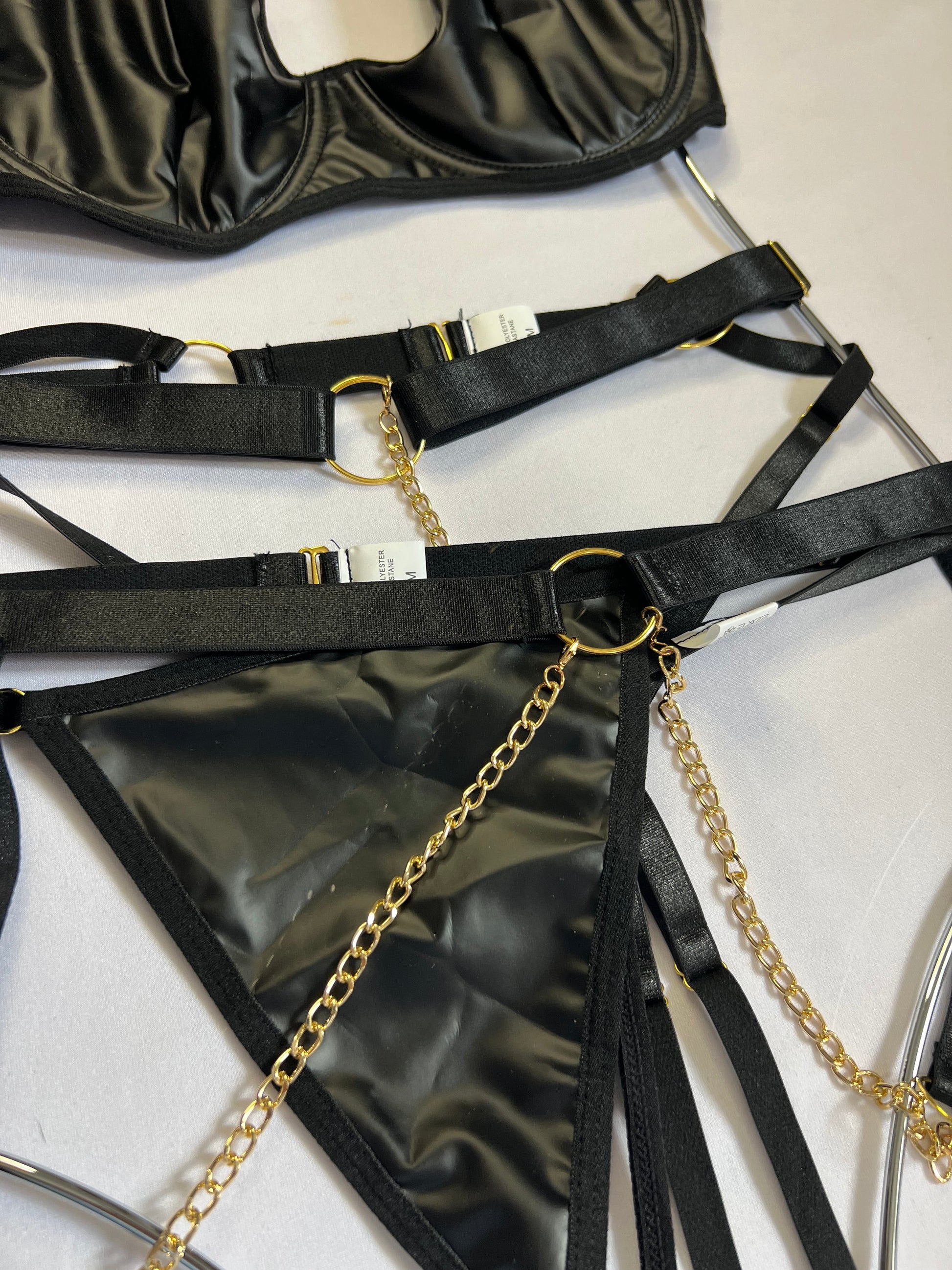 Sultry Black Satin Lingerie Set with Gold Chain Details